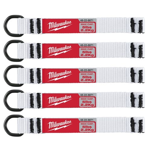 MILWAUKEE D-Ring Web Attachments are designed for use with Milwaukee Self-Adhering Tape to create a secure attachment point on most tools without a lanyard hole. Constructed with durable nylon webbing. Metal D-Ring serves as attachment point for tethering.
