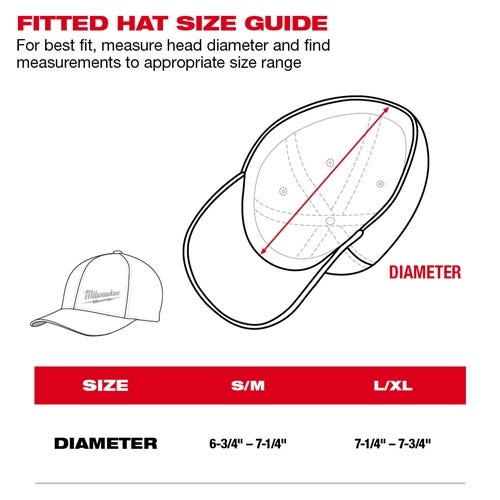 The Milwaukee Fitted Hat is constructed from a lightweight combination of cotton and polyester with an adjustable flexible band. On or off the job site; the curved bill of our fitted caps fits your needs. This hat has a clean; comfortable design with a 3-1/2 crown depth. Fitted cap sizes include S/M and L/XL.