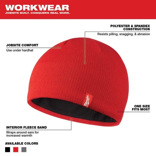 The Milwaukee Fleece Lined Knit Hat features a fleece band around the ears to block wind and provide extra warmth in cold conditions. Beanie style construction allows for easy use under a hard hat. Product intended for cold weather use.