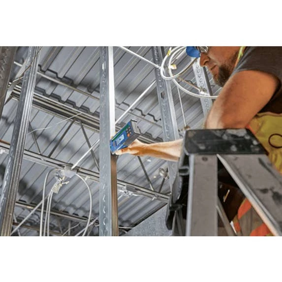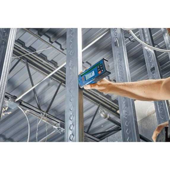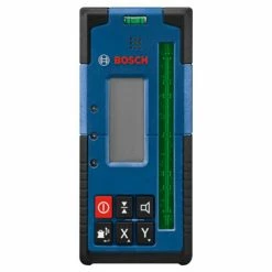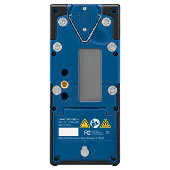The Bosch LR40G Green-Beam Rotary Laser Receiver is designed to enable the GRL4000-90CHVG rotary laser detection up to 2,000 Ft., with a dual-sided backlit LCD display for use in darker areas or outdoors on both sides of the receiver. It has built-in X and Y-axes buttons that allows for elevation and cut-and-fill calculations in both axes up to ±8.5%. The display illuminated large, easy-to-see indicators, including up/down arrows, center line, accuracy level, battery levels and audio signal. It also has LED indicators, to provide easy visual readout and simple operation. The oversized laser detection area helps find the laser beam faster, making it easier to start setting level. The receiver provides convenience features such as built-in magnets for secure attachment to metal surfaces, an adjustable audio indicator, intuitive six-button keypad, receiver vial, attachment hook and ergonomic soft grip.