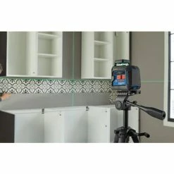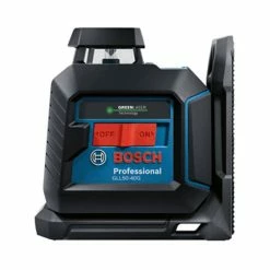 The Bosch GLL50-40G Green-Beam Self-Leveling 360° Cross-Line Laser uses green-beam technology, which emits green lines up to 4X brighter than standard red beams. This gives the laser a working range of up to 100 Ft. in diameter. The laser produces vertical line, 360° horizontal plane and cross-line modes, for a broad array of alignment and leveling applications. It provides 360° coverage to level with one setup point for an entire room. The tool has full rubber overmold housing, designed to be similar to a roll cage, so major impact points are reinforced with rubber. It has an IP64 rating and features deeply recessed windows help protect the laser glass. The one-button onboard user interface allows easy selection among the layout modes. The two-position recessed switch provides additional protection of the switch mechanism.