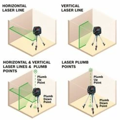 - Plumb points – projects upward and downward green laser points for transferring applications with a range of up to 50 Ft.