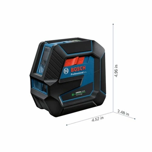 The Bosch GCL100-40G Green Beam Self-Leveling Cross-Line Laser with Plumb Points uses green-beam technology; which emits green lines and points up to 4X brighter than standard red beams. This gives the laser a working range for the lines of up to 165 Ft. The laser produces vertical; horizontal; cross-line modes; as well as upward and downward green plumb points. The tool can project two lines independently or together; for a broad array of alignment and leveling applications.
