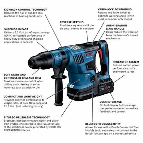 This hammer is part of the PROFACTOR System; which pairs BITURBO Brushless Technology with a CORE18V PROFACTOR battery. BITURBO Brushless Technology is a high-performance motor and drive-train system designed to deliver power comparable to high-demand corded tools. It also has Soft Start and controlled rpm and bpm; making it easier to control drilling and chiseling applications. This hammer features connectivity (module sold separately) to link to the free Bosch Toolbox app. The kit includes two CORE18V PROFACTOR Performance Batteries and a turbo charger with a turbo power boost mode that can charge a CORE18V 8.0 Ah PROFACTOR Performance Battery up to 50% charge in 15 minutes and up to 80% in 26 minutes.