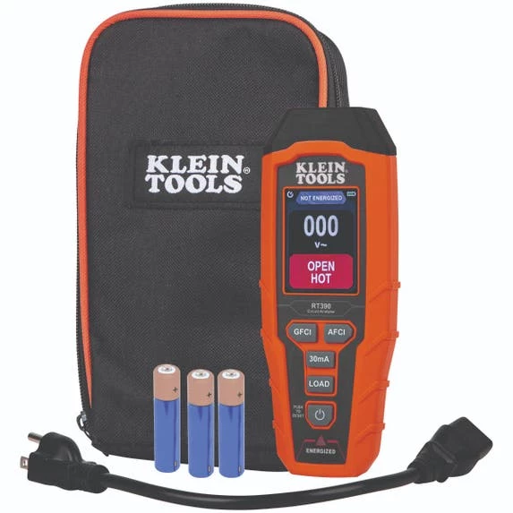 The Klein Tools RT390 is a Circuit Analyzer that tests the wiring conditions at an electrical outlet, displays AC line voltage, inspects AFCI and GFCI devices with time to trip device, and performs voltage drop tests at 12A, 15A and 20A current loads. Results are easy to understand with large, color LCD. The tester is designed for use with North American 120V AC 3-wire electrical outlets.
