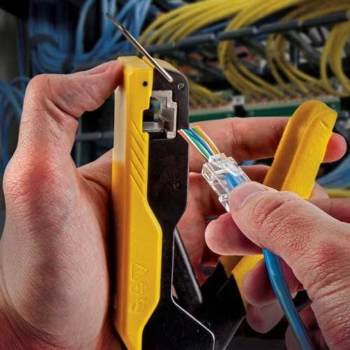 - Fast; reliable RJ45 Pass-Thru modular crimper installs connectors for data applications.