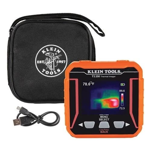 The Klein Tools TI250 is an easy-to-use; USB rechargeable Thermal Imager. The large LCD displays unseen hot and cold spots for instant troubleshooting. Excellent resolution with over 10;000 pixels and your choice of three color palettes. The meter provides high and low temperature points; crosshairs to pinpoint specific temperatures; and options for temperature alarms. The addition of a microSD® Card (optional) allows the meter to capture and store images for reporting.