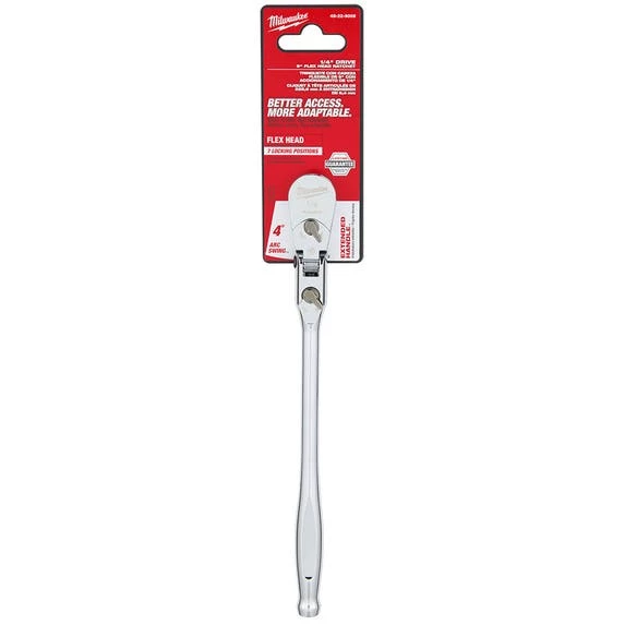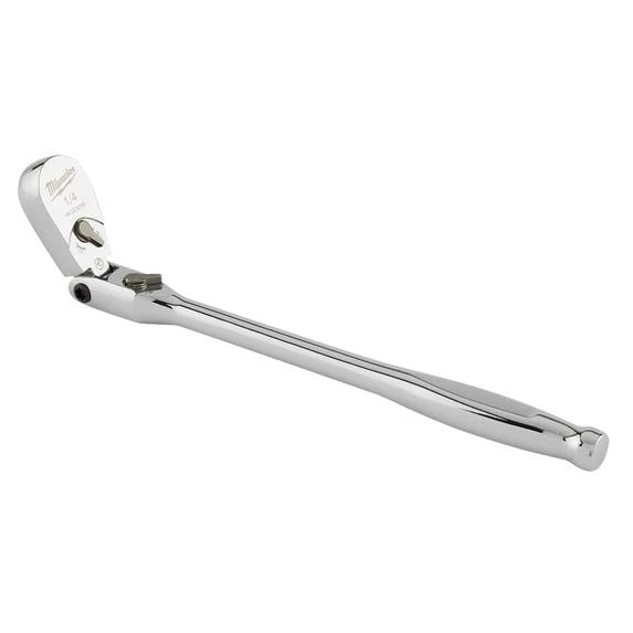 The MILWAUKEE® 1/4” Drive 9” Flex Head Ratchet with a 4⁰ arc swing provides better access and is more adaptable to working in spaces with different angles. The ratchet head can flex to 7 different positions and has a lever to lock the head in place. The extended handle length offers increased leverage for stubborn nuts and bolts, a slim profile design, and a flush directional lever for better accessibility. The all-chrome finish makes cleaning the extended-reach ratchet easy. This ratchet is backed by Milwaukee’s Mechanics Hand Tools Lifetime Guarantee.