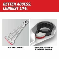 The Milwaukee Metric Flex Head Ratcheting Combination Wrenches feature 2.5 degrees of arc swing and 144