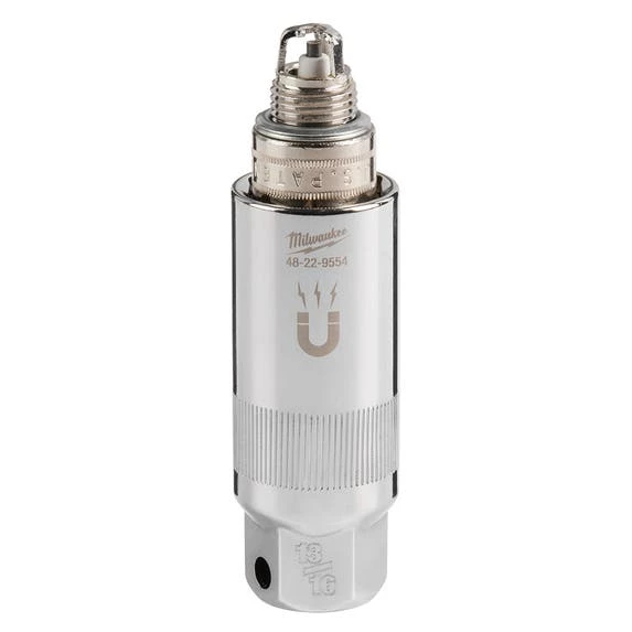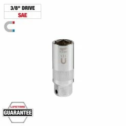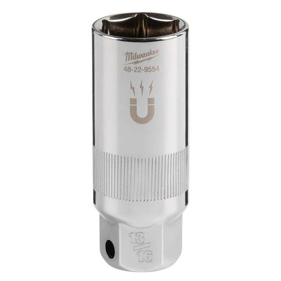 The MILWAUKEE® 3/8″ Drive 13/16″ 6-Point Magnetic Spark Plug Socket features an amplified rare earth magnetic retainer that balances a secure fit with smooth removal of the spark plug from the socket. A precision knurling on the outside of the spark plug socket allows for better control when hand tightening or loosening. Both the socket and retainer withstand harsh chemicals commonly found in the garage. Stamped size markings make it easy to identify the size of the socket. The external hex at the base of the socket fits a 13/16” wrench for added control. Milwaukee® Spark Plug Sockets are backed with a Lifetime Guarantee.