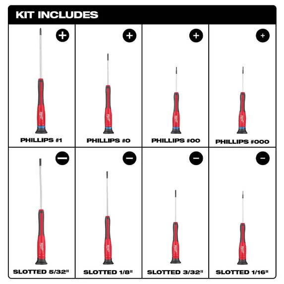 The Milwaukee 8-Piece Precision Screwdriver Set features an All-Metal Core for up to 4X strength with precision