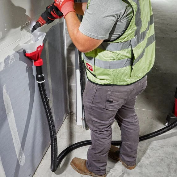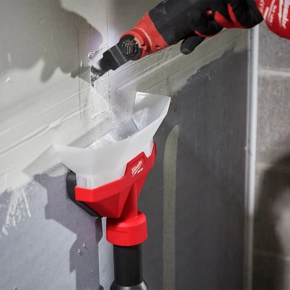 The Milwaukee AIR-TIP Dust Collector collects dust as you work with its rubber seal that maintains suction to a wall for