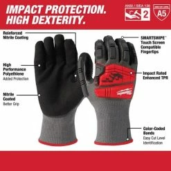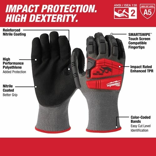 The MILWAUKEE Impact Cut Level 5 Nitrile Gloves offer Impact Protection with High Dexterity. These gloves are ANSI/ISEA Impact Level 2 Rated; and ANSI Cut Level 3 Rated. Impact rated enhanced TPR has been added to the back of the hand for added protection. The dipped gloves have a reinforced nitrile coating between the thumb and index finger for enhanced durability in high wear points. The impact gloves have a nitrile coating for better grip even with wet or oily materials. They have SMARTSWIPE touchscreen compatible fingertips so users can access their devices without taking off their gloves.