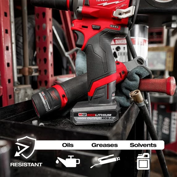 The MILWAUKEE® M12 REDLITHIUM™ HIGH OUTPUT™ XC5.0 Battery Pack delivers 25% more power and runs 25% cooler than other Milwaukee M12 REDLITHIUM™ XC battery packs. The increase in power elevates the performance of the entire MILWAUKEE® M12™ system and drives the next breakthrough in M12 FUEL™. The lithium-ion battery delivers fade-free power and runs substantially cooler through demanding applications, allowing you to push your cordless power tools throughout a wide range of applications. Each battery pack is built for heavy-duty use, runs cooler, and performs in climates below 0°F/-18°C. In addition, the M12 REDLITHIUM™ HIGH OUTPUT™ XC5.0 is built with a resistant housing, increasing the protection against exposure to common oils, greases, and solvents found in transportation maintenance and manufacturing environments. The M12 REDLITHIUM™ HIGH OUTPUT™ XC5.0 is fully compatible with 125+ M12™ solutions.