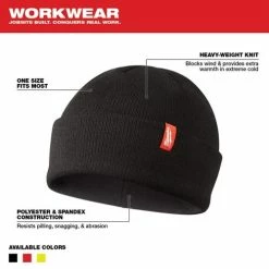 Milwaukee Cuffed Beanies feature a heavier yarn weight that helps block wind and provide extra warmth in cold conditions. Durable 98% Polyester; 2% Spandex construction resists pilling; snagging and manages moisture to help prevent sweating and overheating. Product intended for cold weather use.