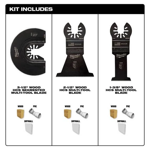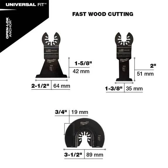 Milwaukee’s Universal Fit OPEN-LOK 3-Piece Wood Cutting Oscillating Multi-Tool Variety Pack offers you an assortment of our next-generation oscillating blades for optimal cutting performance in wood, PVC, drywall, and other soft materials. The oscillating wood blades are designed with aggressive, precision ground teeth for fast cuts in wood, drywall, and PVC. This MILWAUKEE oscillating tool blade variety pack is designed and made in the USA with global materials.