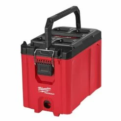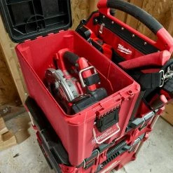 The PACKOUT Compact Tool Box is setup like an old school Ammo Box with similar dimensions (16.3″ 12.87″ 9.8″) and a large front latch with hinges on the back. Very versatile with adjustable dividers and top tray, however remove the dividers and it can even house your M18 FUEL circular saw. IP65 rated for weather protection, lockable, fits well into the PACKOUT system, equal to height of 3 traditional PACKOUTs or 6 slims it’s a nice solution for those taller items. Very high 75 lbs. weight limit, constructed with impact resistant polymers, this is one tough box for storage.