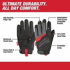 Milwaukee Performance Work Gloves are designed to provide Ultimate Durability and All Day Comfort. Featuring Smartswipe fingertips; knuckles and palms designed to allow the use of touch screens; and high dexterity fingertips to provide precision when handling small objects. A reinforced thumb seam provides enhanced durability and the hook and loop closure ensures a secure fit. In addition; a breathable lining and built-in terry cloth sweat wipe ensure the gloves remain comfortable enough to wear all day.