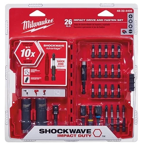 - Milwaukee SHOCKWAVE Impact Duty Driver Bits; Nut Drivers; Sockets; and Socket Adapters are engineered for extreme durability and up to 10x life. Made from proprietary steel and heat treated to control hardness; the SHOCKWAVE Impact Duty Driver Bits feature an innovatively designed geometric shock absorption zone to extend life. The forged tip allows for a secure grip and maximum contact eliminating stripping or slipping. . The SHOCKWAVE 26PC Drive and Fasten Set provides a fastening solution for all standard hex sizes 1/4 to 9/16″.