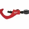 The Milwaukee Tubing Cutter offers you straighter, cleaner cuts. It features a replaceable V-shaped, double ground steel blade for clean perpendicular cuts and maximum tool life. The one-handed locking mechanism is designed for an easy-to-use lock for improved tool safety. This MILWAUKEE Tubing Cutter has an all-metal core for added durability on the jobsite.